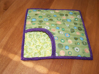 I made two sets. Both gifts. These are going to James, a co-worker. The green one is smaller. When I was squareing it, I cut one side too short. Oh well, nothing says that have to be the same. I used a batik jelly roll strip for the binding for the gifts.